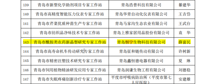 ? ? ? ?此次獲評(píng)青島市專家工作站,恒寧生物將以此為契機(jī),不斷引進(jìn)人才、不斷創(chuàng)新,專精科研,引領(lǐng)行業(yè)發(fā)展,進(jìn)一步推動(dòng)農(nóng)藥行業(yè)產(chǎn)學(xué)研創(chuàng)新,為提升青島市農(nóng)藥行業(yè)的核心競(jìng)爭(zhēng)力做出積極貢獻(xiàn)。